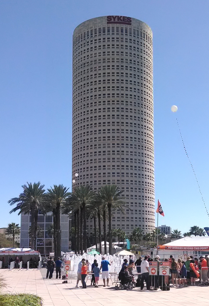 Rivergate Tower is approximately 48.5 meters (53 yards) in diameter, and its approximate center coordinates are latitude 27.947267, longitude -82.460581. Its size and location determine the size and location of all the planets in our model solar system. The Sun is 1,392,000 kilometers in diameter, so dividing by the tower’s diameter yields a scale of 1 to 28.7 million. To arrive at all of the other distances and sizes of our model, we divide the actual measurements by 28.7 million.